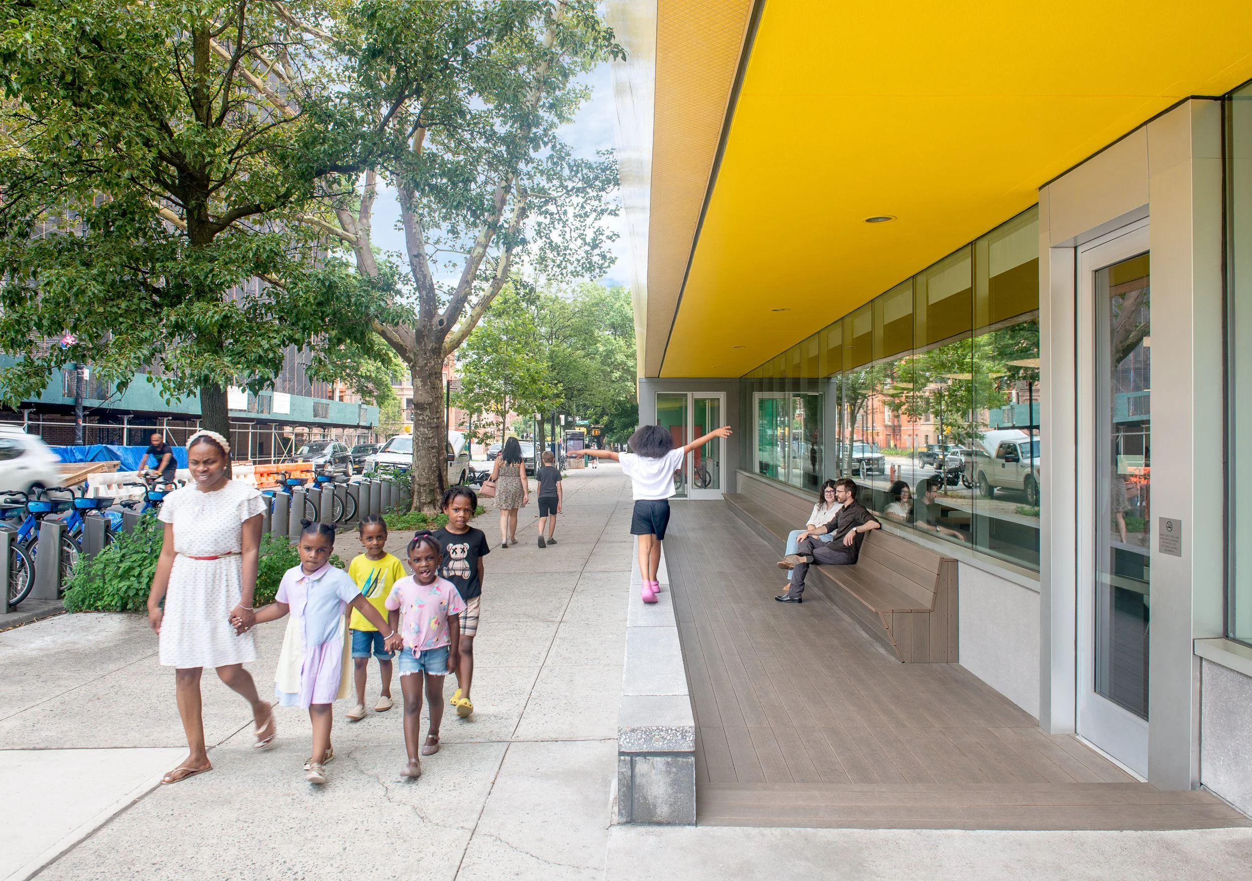 Responding to the community’s stated desire for natural light, openness, and connection to the neighborhood, and the community’s critique of the original Library as dark and dim, we illuminated our design with an expansive window-wall along the entire facade. Our design anchors the Library in the community, allowing bright sunlight to enliven the main library spaces, affording views of the green tree-lined street and the activities occurring on the Reading Porch and the sidewalk, enabling passersby to view the activities going on inside the Library, and empowering the Library to become a beacon in the evening when its warm light spills out invitingly onto the streetfront to welcome Brooklynites to their Library.